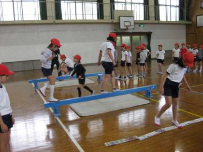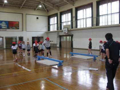 4年生が体育館で,体ならしの運動をしていました。自分なりに工夫をしながら運動を楽しんでいました。