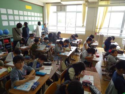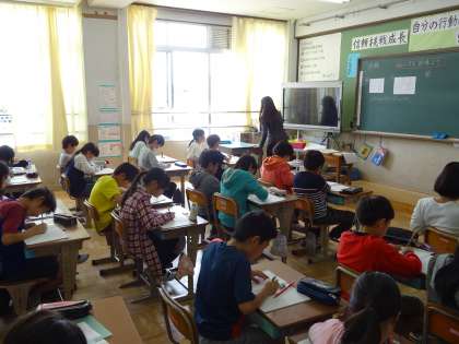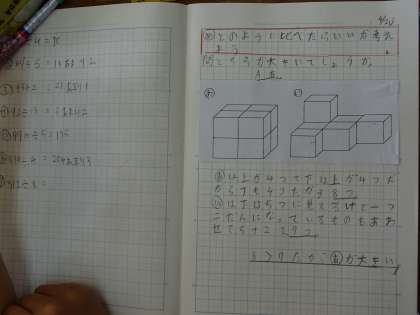 立体の体積の絵から比べ方を考えて,説明をしていました。