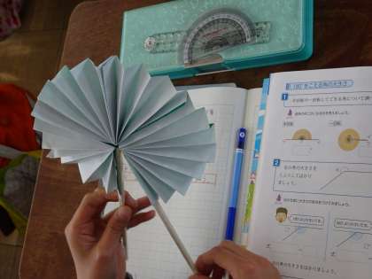 手作りの扇を使って,180度をこえる角の大きさを考えていました。