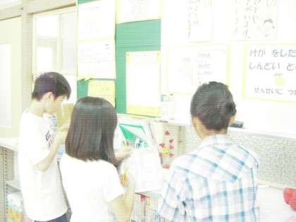 保健安全委員会では,三人一組で曜日を決めて,学校の安全やみんなの健康を守れるように毎日活動しています。家庭訪問期間やゴールデンウイークで,本格的に活動が始まるのはこれからです。今日は「ほけんの日」の生活点検シールを1枚1枚はさみで切って,クラスに配る準備をしていました。保健安全委員会の仕事は,トイレや手洗い場の整備、ポスター作りなどたくさんの仕事があります。とても頼もしい5年生6年生のメンバーですので,1年間がんばってほしいと思います。