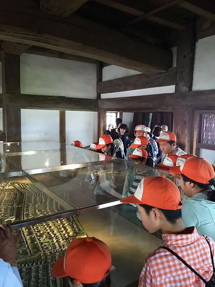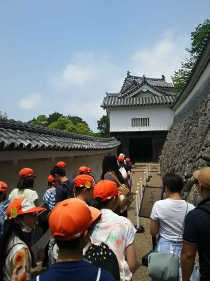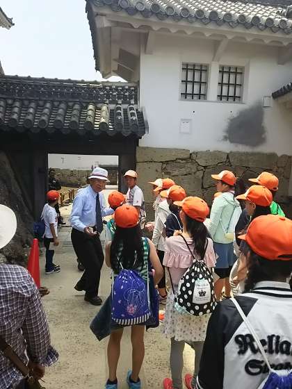 姫路城にて,見学を開始しました。歴史ガイドボランティアの方のお話を聞きながら,グループで見学をしています。
