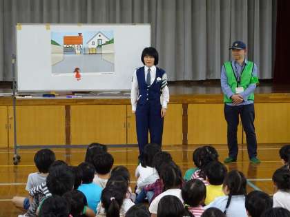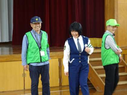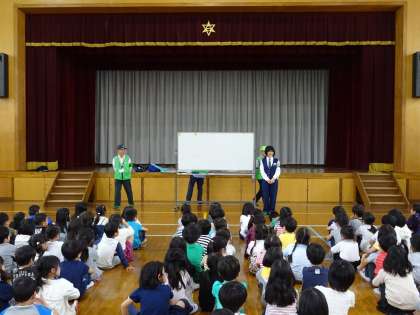 9日(火)京都府警察伏見警察署の交通課の警察官と京都府公安委員会委嘱の「伏見地域交通安全活動推進委員協議会(地活)」の皆様にお越しいただき,交通安全教室を行いました。