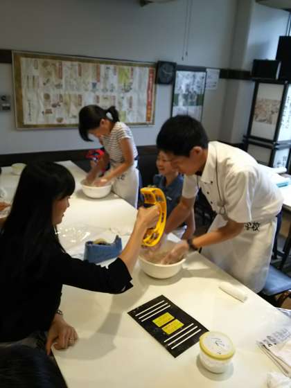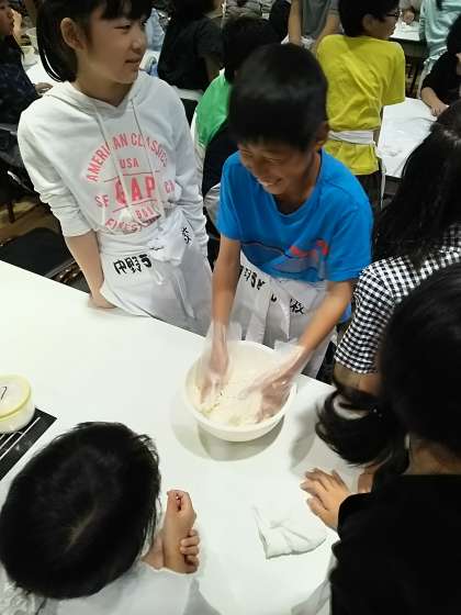 生地づくりに挑戦です。リズムに合わせて行うとよい生地になるそうです。