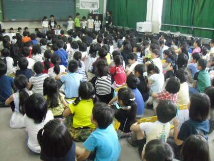 2年生から名札のプレゼント,1年生はとてもうれしそうでした。