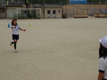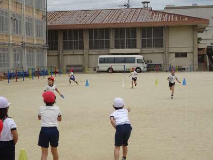リングバトンを使って,リレーを楽しんでいました。上手く折り返せるかどうかで,勝敗は分かれます。すればするほど,子どもたちは上達していきます。
