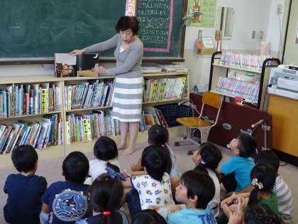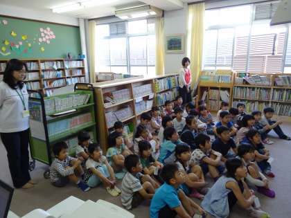 1年生は学校図書館の利用の仕方を学び,図書支援員の先生に読み聞かせをしてもらいました。