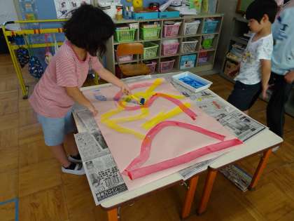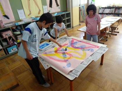他校との交流会に向けて,プログラム等の準備をしています。ローラーの力加減や色の濃さに注意して,模造紙に着色していきました。