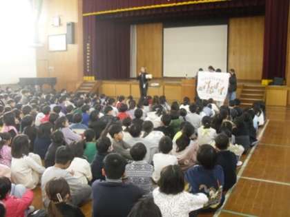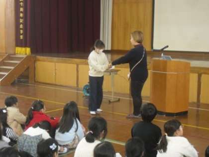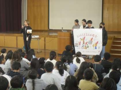 本日の児童集会では、まず赤い羽根募金の贈呈を行いました。