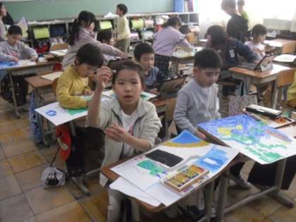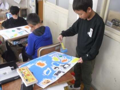 こちらのクラスは少し進んでいて、版をしたあと、そのまわりに色を塗っていました。