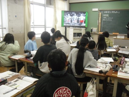社会科では「原爆投下と戦争の終わり」について学習しています。資料や動画をもとに、戦争がどのように終わっていったのかを考えています。