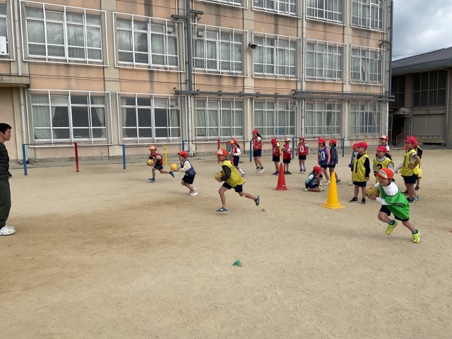 2年生は体育でリレー遊びに取り組んでいます。コーンを回って一生懸命走り、友だちと声を掛け合いながら楽しそうに活動しています。どのチームも力を合わせ、最後まで全力でがんばる姿がとても印象的です。