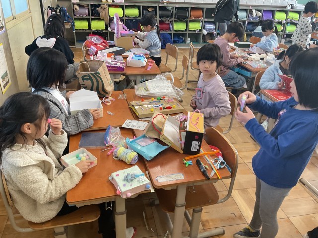 手紙やシール、ぬいぐるみなど、自分だけの大切なものを入れる様子を想像しながら、楽しそうに箱を飾り付けていました。