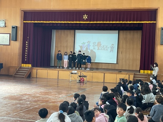 続いて給食委員会が、紙しばいを使って“自分が食べられる量を考えて、残さず食べることの大切さ”について教えてくれました。その後、環境委員会からは学校で出るゴミの分別についてのお話があり、身の回りの環境を大切にすることについて改めて考える時間になりました。