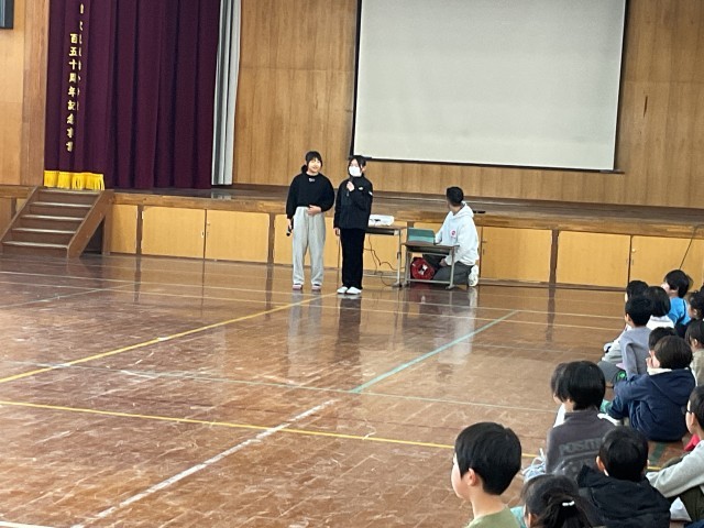 今日は児童集会を実施しました。まずは新聞飾り委員会が登場し、これまで学校新聞に載せていた記事から楽しいクイズを出してくれました。
