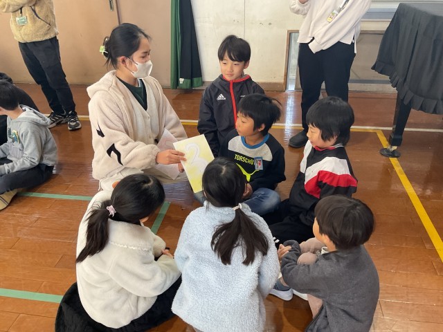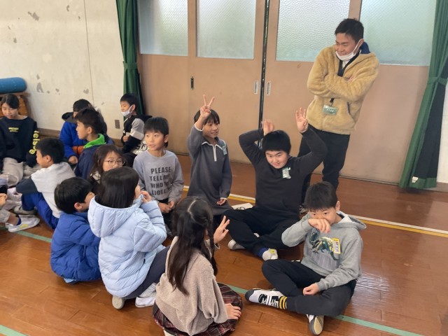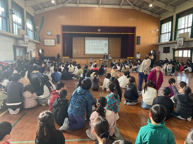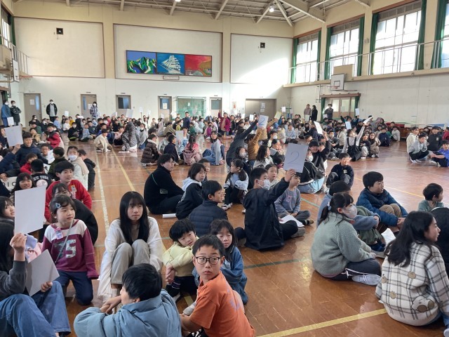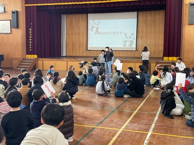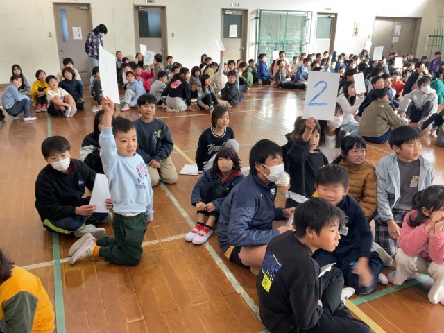 子どもたちは縦割りグループに分かれて、「どれだろう?」「これ知ってる!」と相談しながら答えを考えており、体育館には笑顔がいっぱい広がっていました。