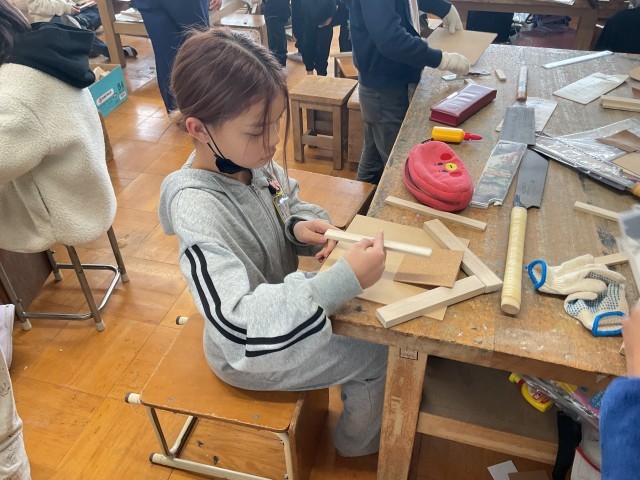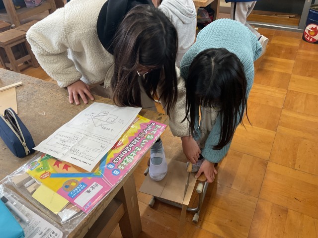 今日は、はじめてノコギリを使って木を切る活動にチャレンジ。子どもたちは、安全に気をつけながら、慎重に木材を切っていました。