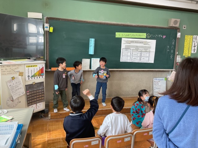 生活科の「もうすぐみんな2年生」の学習の一環で、保育園や幼稚園の子どもたちから、小学校生活で気になっていることや楽しみなこと不安なことなどを事前に聞き、そのことについてグループで発表をしました。