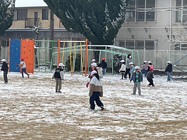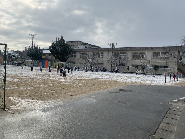 白く染まったグラウンドを目にした子どもたちは、たちまち目を輝かせ、歓声を上げながら運動場へ飛び出していきました。