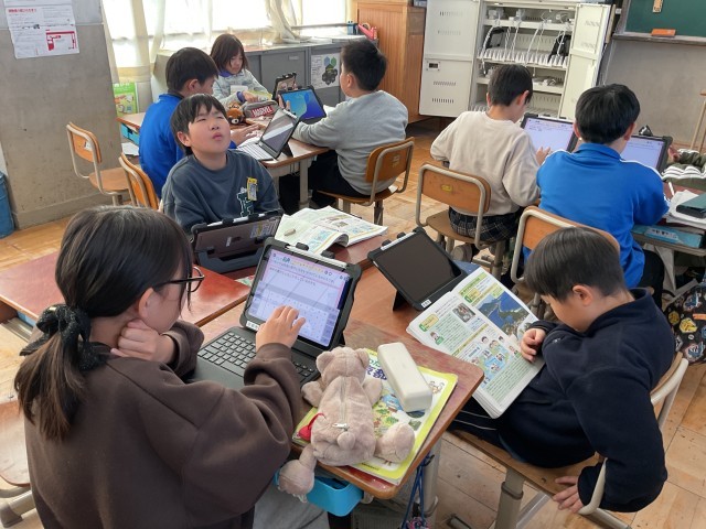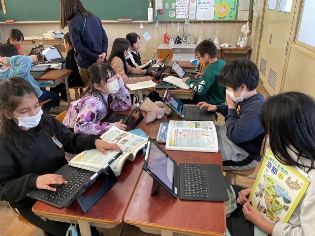 舞鶴市が交流を深めている国について調べ学習を進めています。まずは自分で調べ、それぞれが調べた内容をグループで交流していました。