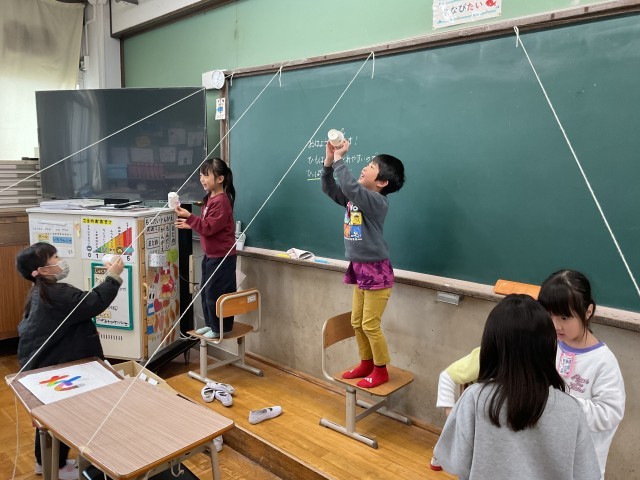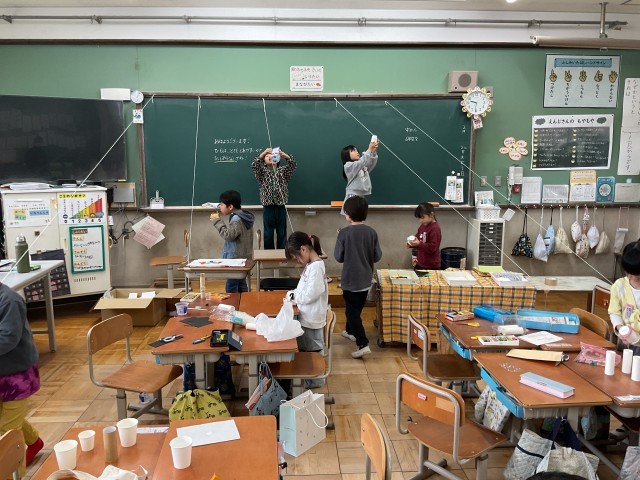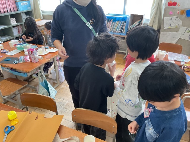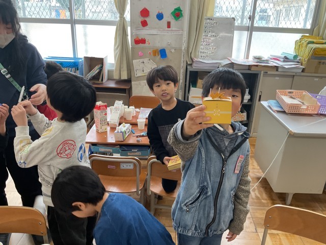 ひもに通してすべらせる作品を自分で考えて作り、教室中で楽しそうに動かしていました。