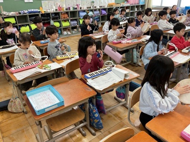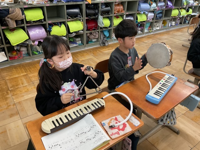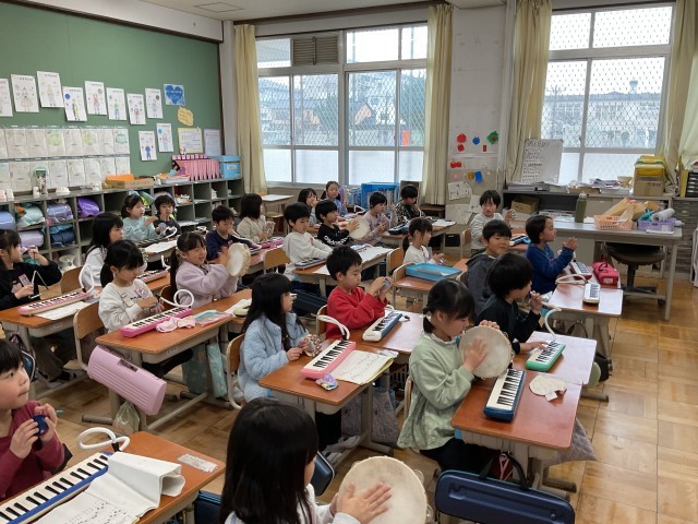 鍵盤ハーモニカをはじめ、タンバリン・カスタネット・すず・トライアングル・たくさんの打楽器を使い、リズムに合わせて楽しそうに演奏していました。