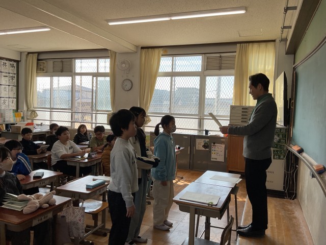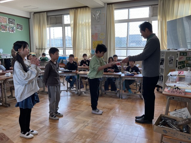 社会科で学習した「琵琶湖疏水」をテーマに作成した新聞が表彰され、子どもたちは校長先生から賞状を受け取りました。学習の成果を生かした丁寧なまとめが高く評価されました。