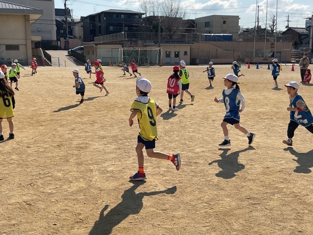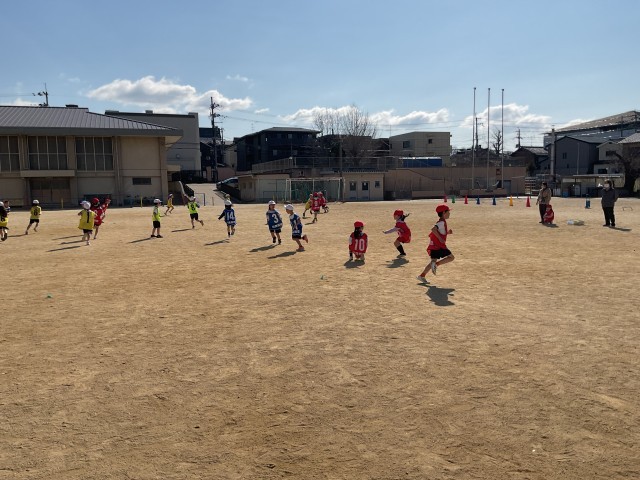 子どもたちは色おにをして元気いっぱいに遊んでいました。必死に走る中でぶつかって転ぶ場面もありましたが、すぐに起き上がってまた笑顔で参加し、楽しむ姿が見られました。