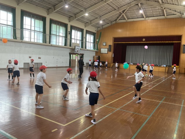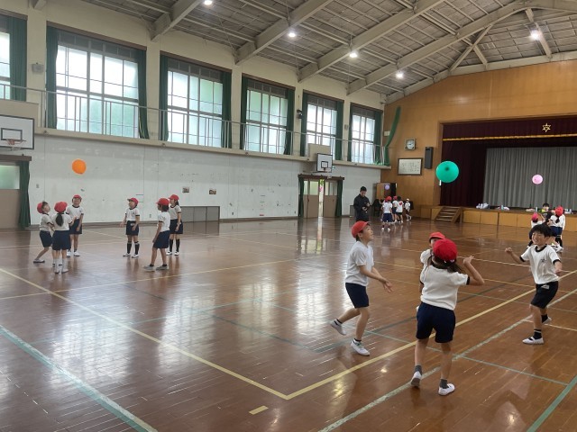 体ほぐし運動の様子です。風船が落ちないようにチームで協力しています。