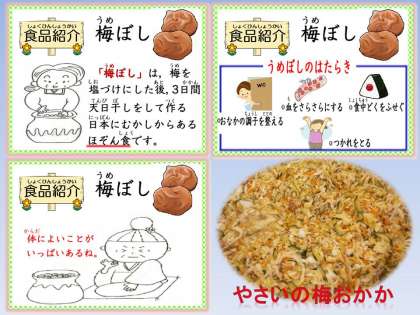 梅は,冬に花を咲かせ実をつけます。その実を塩でつけこんで作る「梅ぼし」は,日本に昔からある保存食で,暑くなる今の季節にピッタリの食材です。「梅ぼし」の働きを紹介することで,運動会を次の日にひかえた子どもたちは,しっかり食べる意欲がわいてきたようです。『やさいの梅おかか』の中には,これから旬をむかえる「きゅうり」も使っているので,シャキシャキ コリコリとした野菜の歯ごたえとさっぱりとした「梅ぼし」の香りと酸味をおいしく味わうことができました。