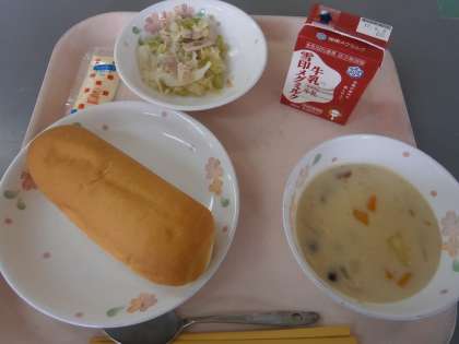 今日の給食は,セルフサンドイッチ『ハムサンド』と『チャウダー』でした。