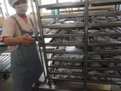 魚を並べたり 粉を振るったり 衛生的に行えるよう エプロンを使い分けたり作業の分担をしたりしました。