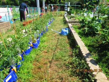 連日の 日照りで トマトは 大きく葉を 茂らせています。