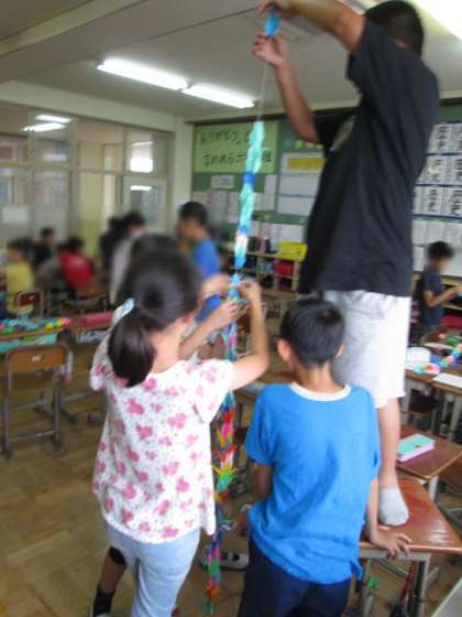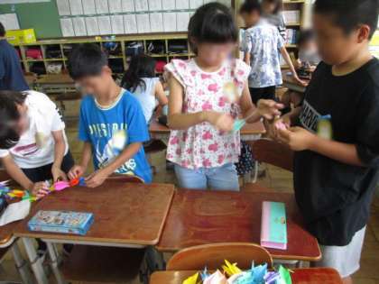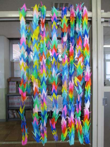 学年全体の折り鶴が千羽を超えました。たくさんの折り鶴をつなげ,気持ちのこもった千羽鶴を作っています。