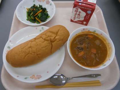 「こくとうこっぺぱんがおもちみたいにふわふわしているところがおいしかったです。トマトシチューは,あつかったけどじゃがいもがほくほくしておいしかったです。いつもおいしいきゅうしょくありがとうございました。」・・・2の1