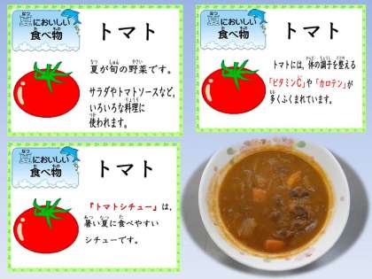 「トマトシチューがたべやすくしるがトマトあじでした。トマトシチューの中のぎゅう肉がやわらかくてたべやすくておいしかったです。ほうれんそうがやわらかくておいしかったです。こくとうコッペパンとトマトシチューをいっしょにたべたらおいしかったです。いつもおいしいきゅうしょくをつくってくれてありがとうございます。」・・・つくし