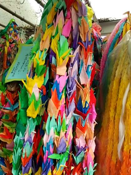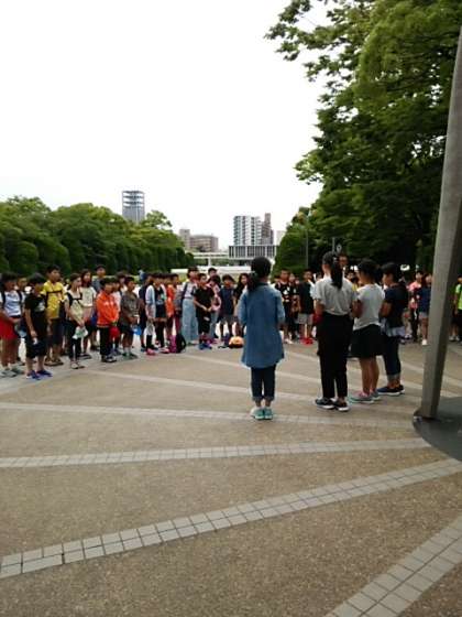 原爆の子の像の前で,平和集会をし,みんなで平和を願って折った「千羽鶴」を納めました。次は,平和記念資料館を見学します。