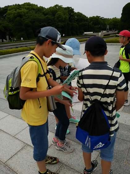 平和記念資料館を見学した後,グループに分かれて,平和記念公園内のオリエンテーリングを行っています。公園内にはたくさんの碑や像があり,私たちに平和の大切さを訴えています。