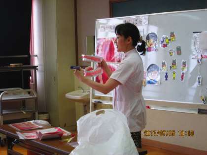 などを 学習したあと,軽快な 音楽に あわせて 実際に 歯を みがきました。