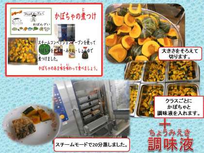 『かぼちゃの煮つけ」は,スチームコンべっクションオーブンを使って 一クラスずつそのまま食缶として使えるハンドル付のホテルパンンで調理しました。煮崩れることなくきれいに仕上げることができました。冷めていく時に材料に味が染み込む性質を生かして,出来あがりから子どもたちが食べるまでの時間を考えました。時間をおくと甘味が増し よりおいしくなりました。