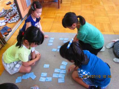 数人ずつ 輪を作って 五色百人一首の札のうち青色の20枚を 取り合う形に しました。