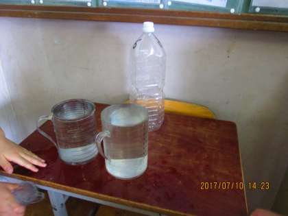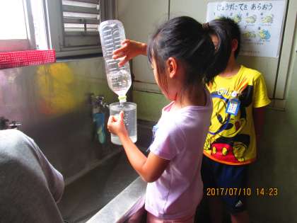 さっそく,子どもたちは,ペットボトルなどの 水の かさを 「リットルます」で はかりとる活動を 始めました。