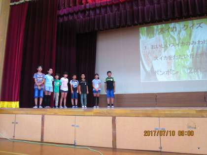 すいかクイズを3問出しました。いずれも2択で,全校の子どもたちに 答えてもらいました。