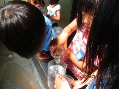 そのあと,デシリットルますを もって いろいろなものに はいるかさを はかりとる活動をしました。