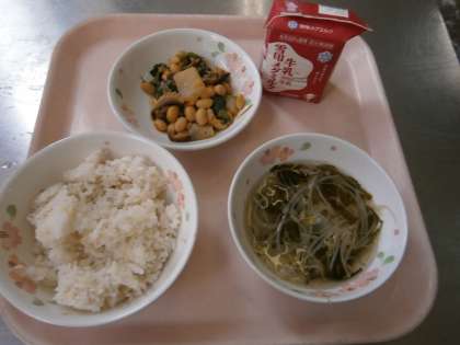 今日の給食は,大豆料理『肉みそ炒め』でした。今月の給食目標は,「よくかんで食べよう」です。今日の豆料理はよくかんで食べる献立の一つです。日本では卑弥呼の時代に食べていたものを考えると現代は,食べ物が豊かになりましたが,加工食品も増え噛む回数が少なくなっています。