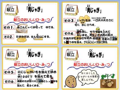今日の給食は,芋料理『肉じゃが』でした。給食カレンダーでや電子紙芝居「給食室からこんにちは」で,作り方を紹介しました。