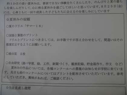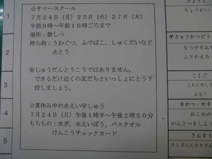 学年だより「夏休み号」(7月21日金 配布)で サマースクールや 水泳学習の日程,夏休みの宿題について お知らせを しましたので,ご確認のうえ,計画的に 学習がすすむように ご協力を お願いします。