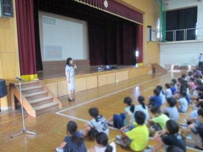 夏休み前の最後の朝会を行いました。学校長から各学年のがんばりと成長についてお話がありました。子どもたちは自分の成長を認めてもらい,笑顔で話を聞いていました。