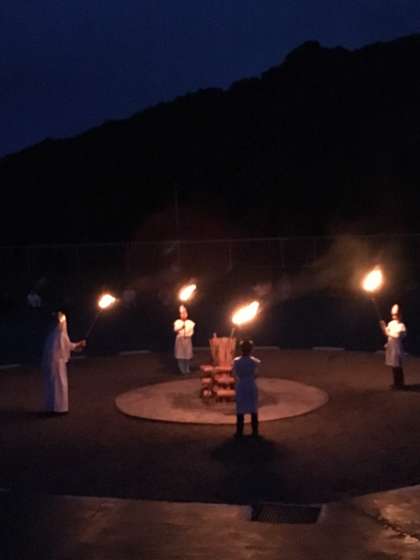 第1営火場でキャンプファイヤーを行いました。火の神が登場し,火の子に大切な「火」を授けてくださいました。