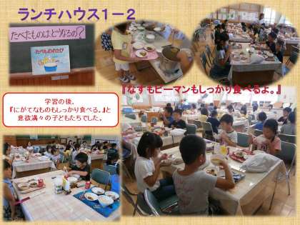 一緒に給食をたべた1年生は,「たべたものはどうなるの」の学習の後に,苦手なピーマンやなす・ごぼう・なま節にも意欲的に挑戦する子どもたちの姿をたくさん見ることができました。