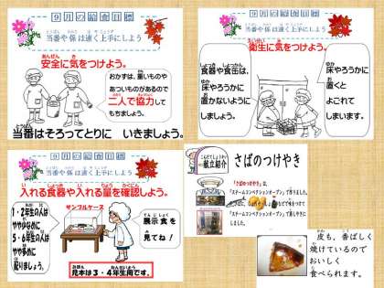 「給食室からこんにちは」や給食カレンダーでは,今月の給食目標の「当番や係は速く上手にしよう」で安全に気をつけて運ぶことを中心に考えました。